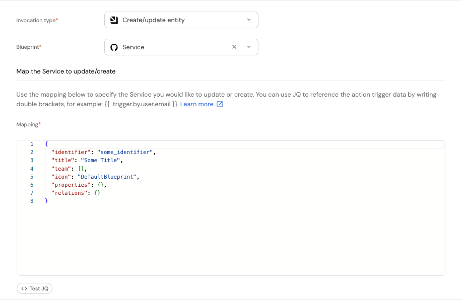 Field Description identifierUsed to identify the entity in your software catalog. If it already exists, the entity will be updated, otherwise it will be created. titleThe title of the entity. teamThe team/s this entity will belong to. iconThe icon of the entity. propertiesThe properties of the entity, in "key":"value"pairs where the key is the property's identifier, and the value is its value.relationsThe relations of the entity, in "key":"value"pairs where the key is the relation's identifier, and the value is the related entity's identifier (for single relations) or an array of identifiers (for "many" relations).