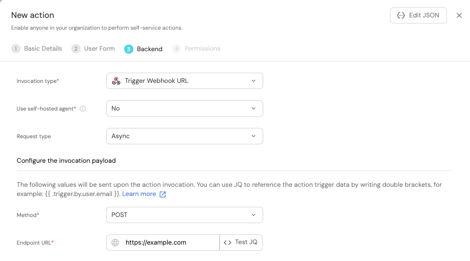 Choose Trigger Webhook URL as the backend type when creating a new self-service action or automation.