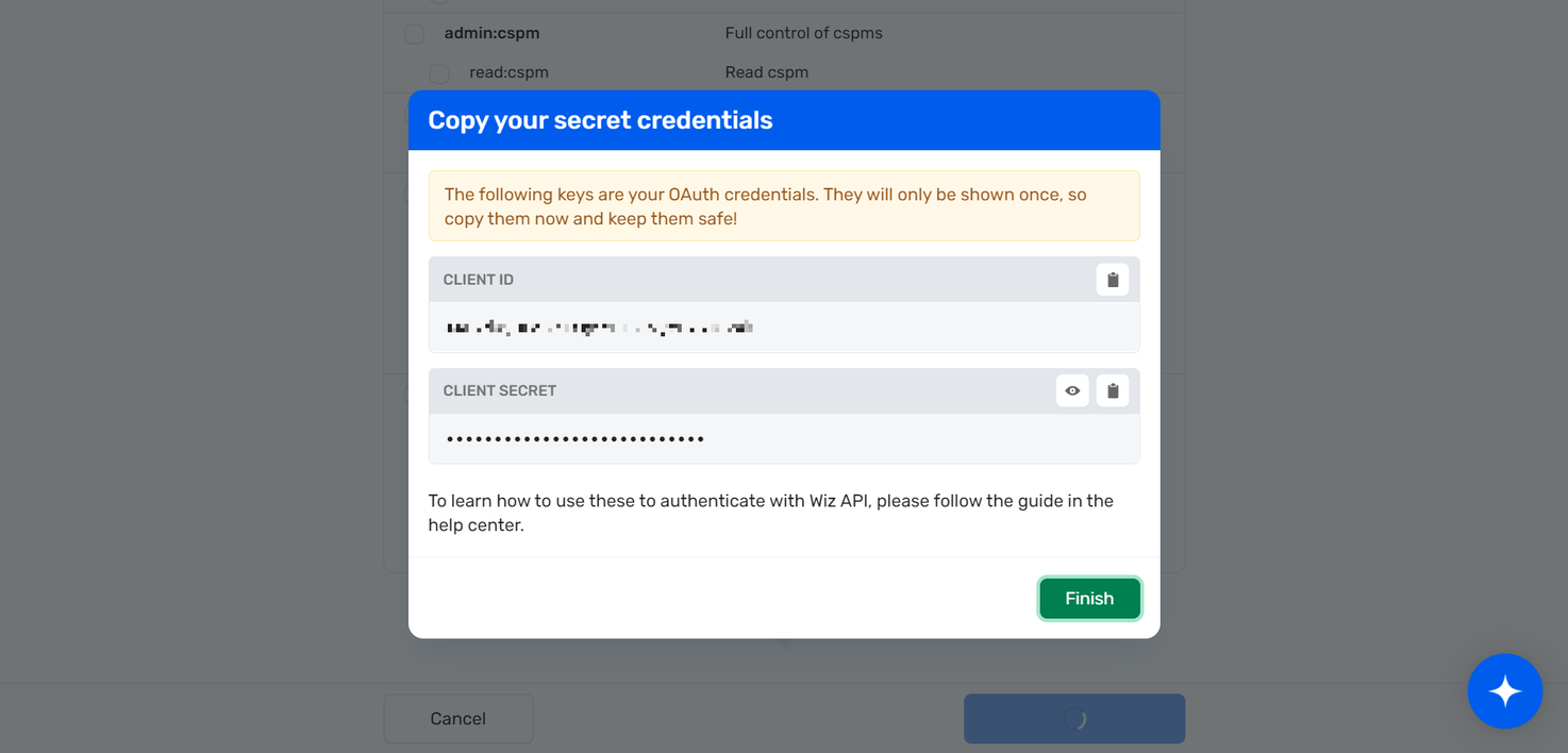 - Retrieve Credentials: Wiz will display your Client ID and Client Secret.