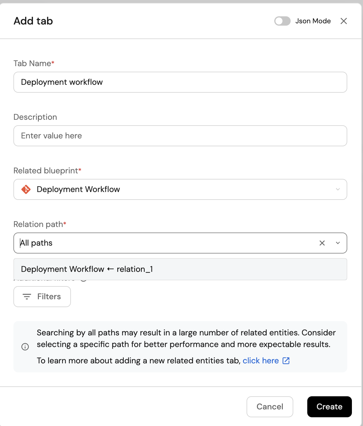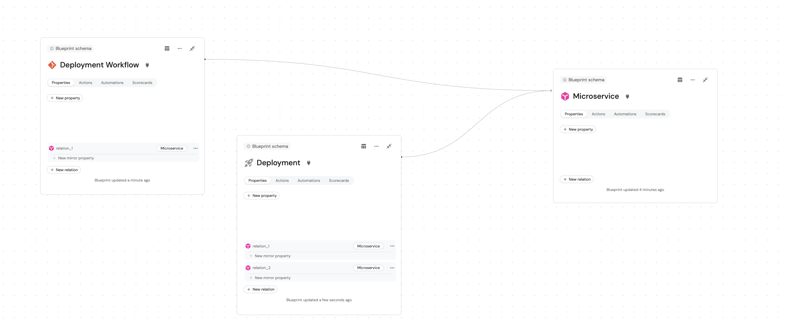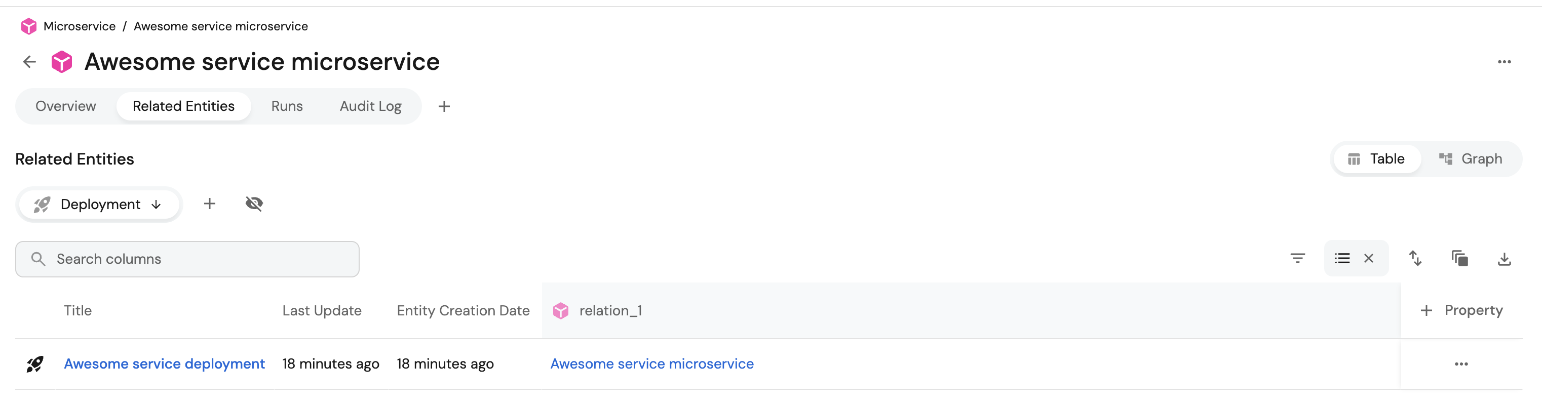 When you're on the entity page of a Deployment Workflow, the related entity Microservice automatically appears, but Deployment does not, since its relation is in the other direction. However, you can create a custom tab to show Deployment entities by leveraging the indirect relationship through Microservice.