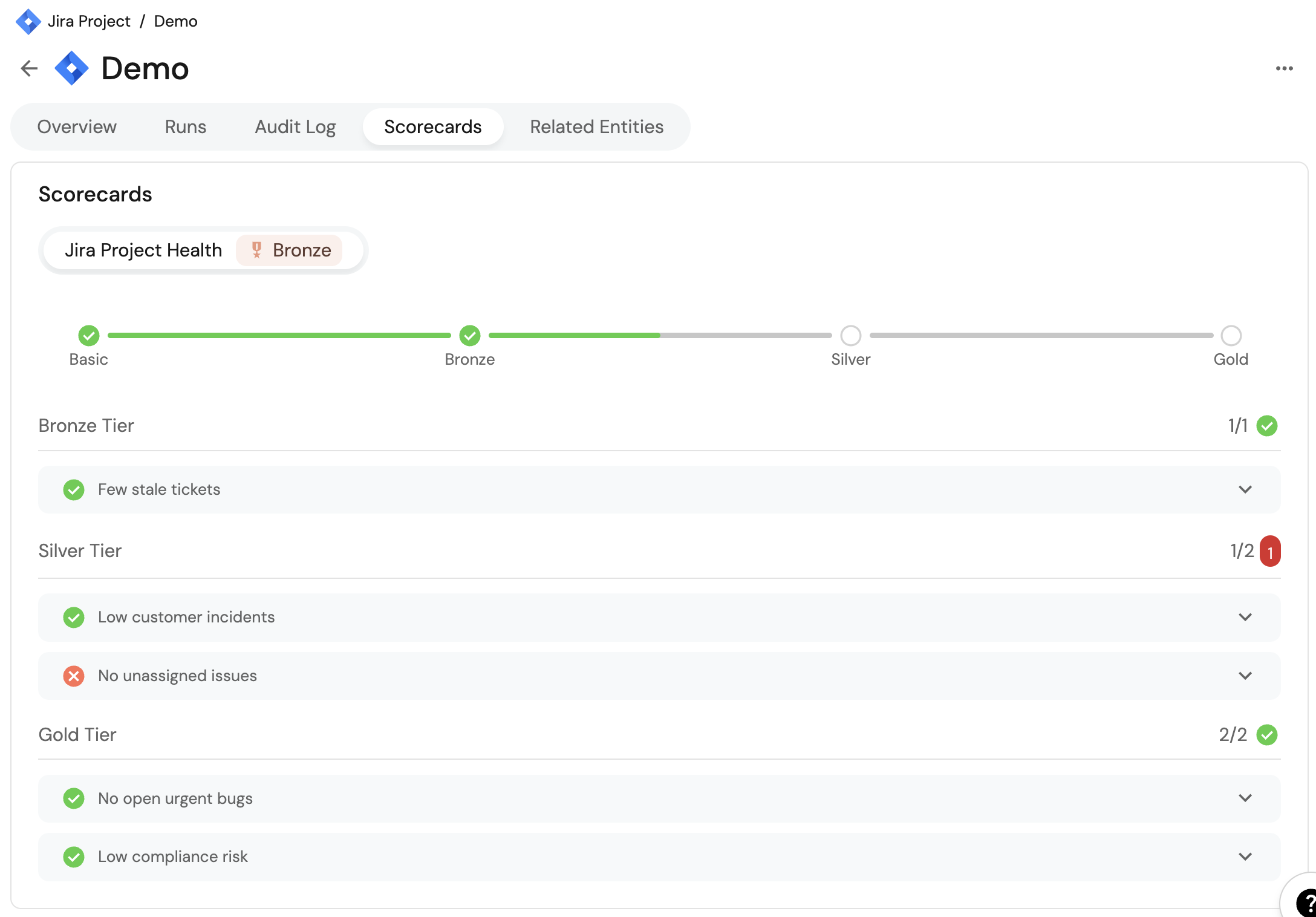 This guide demonstrates how to track the health and operational maturity of your Jira projects using scorecards in Port. By tracking Jira project metrics like stale tickets, open customer incidents, and compliance issues, you can highlight risks and nudge teams toward better practices.